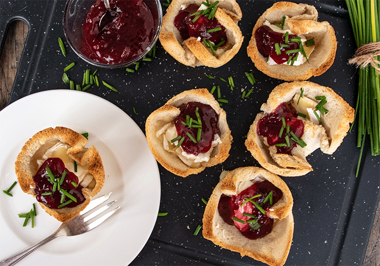 Die Toastscheiben werden von der Rinde befreit, mit einem Nudelholz dünn ausgerollt und in die Mulden eines Muffinblechs gedrückt. Diese füllt ihr dann mit dem klein geschnittenen Camembert und stellt das Ganze für 15 Minuten in den vorgeheizten Backofen. Anschließend gebt ihr je 1 TL Frischkäse und Preiselbeeren auf den geschmolzenen Käse, streut Schnittlauch darüber und schon geht´s ans Genießen, denn die Toastkörbchen werden natürlich warm serviert.